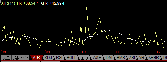 威尔德发现较高的ATR值常发生在市场底部,并伴随恐慌性抛盘。当其值较低时,则往往发生在合并以后的市场顶部。 由于惊恐购买所驱使的价格的剧烈下跌,这一指标在市场底部通常可以达到一个较高的价值。