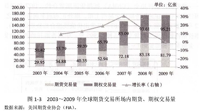 根据美国期货业协会对全球主要衍生品交易所的统计,2000~2009年的 10年间,全球期货和期权的交易规模不断扩大。(见图1-3)